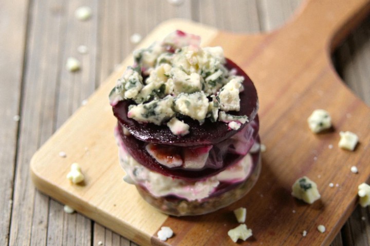 Užkandžio sudėtis: apdorota silkė, raudonasis svogūnas, virtas burokėlis, mėlynasis pelėsinis sūris,