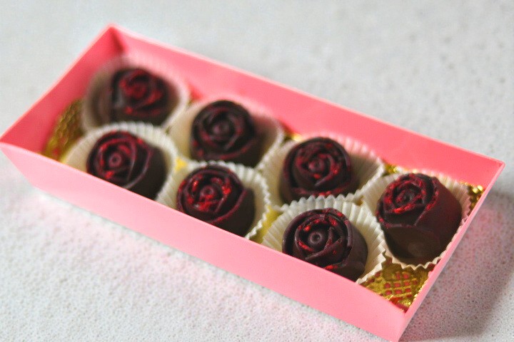 82 proc. juodojo šokolado rožytės su liofilizuotomis avietėmis